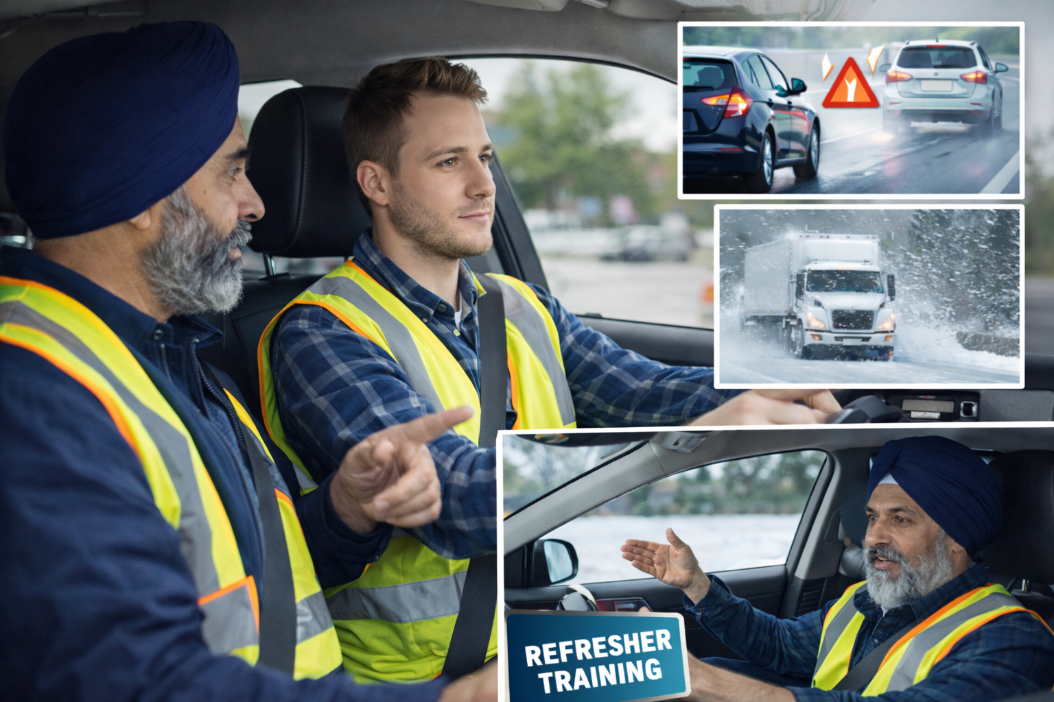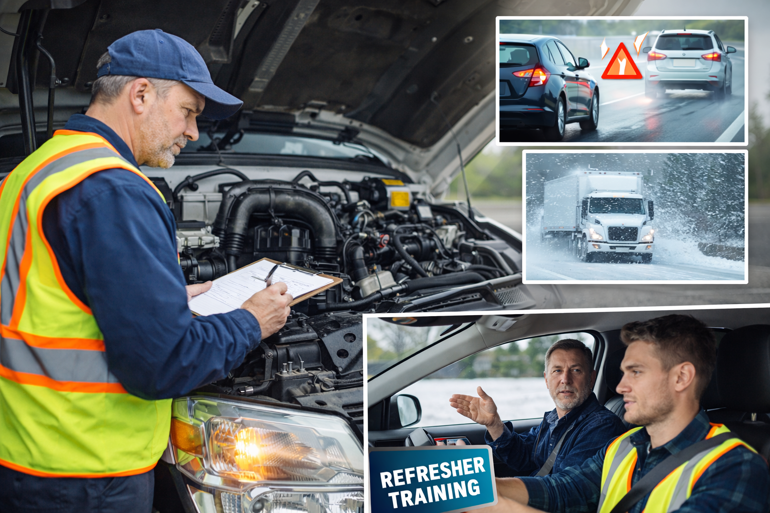 Pre-trip inspections, defensive driving, winter driving for heavy vehicles, and refresher training programs.